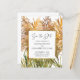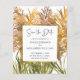 Você realizará sua cerimônia de casamento no sul ou talvez na praia? Nosso cartão colorido de Save the Date econômico ajuda a criar a atmosfera certa com um arranjo floral abstrato boho de hastes de grama das pampas em tons de dourado, rose gold e verde. A ilustração do texto "Save the Date" é definida em uma fonte de letra elegante e todo o restante do texto na frente e no verso do cartão pode ser facilmente personalizado por você no modelo.