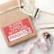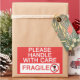 Sticker diz "Por favor, trate com cuidado - Frágil" com uma fotografia de um vaso partido atravessado.