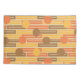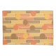 Esta fronha tem um design moderno de meados do século de retângulos repetidos em laranja, dourado e marrom com círculos sobrepostos.