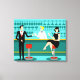 Cada hora é feliz com esta Impressão de Tela Estreita de Cocktail Retro. O design moderno do meio século apresenta um vibrante estilo, minimalista, de 1960 desenho de um bar de coquetel clássico. Contra o pano de fundo de uma parede aqua, podemos ver filas de óculos de bebida. Pelo menos podemos ver os teais silhuetas de óculos de bebida. A julgar pelas formas do material, este bar está bem equipado para molhar o assobio, seja qual for a sua preferência pela bebida. Um barman mais competente e personável é manejar o bar com sotaques amarelos. O jovem barman está vestindo uma camisa branca e primitiva com gravata arco preta. Sua boa aparência, cabelo louro e óculos de hipster pretos nos dão todas as razões para acreditar que ele passa seus dias como um ator em luta ou um super-herói. Por um lado, o bonito mixologista está entregando um martini a um cliente do lado oposto do bar. O cliente que espera é um cavalheiro de ombros largos com um terno preto e gravata vermelha. Ele é o tipo de sujeito que é descrito como alto, escuro e bonito mesmo quando ainda é horas até a hora de fechar. Parece que há um banco de bares vermelho e cromo com o nome do Sr. Debonair. No entanto, para não ser presunçoso, ele pergunta, "Desculpe-me. Este assento está ocupado?" Ele está perguntando à garota cabeleira no banco de bares vizinho. Ela é do tipo "garota ao lado", se você vive ao lado de uma beleza perfeita com uma figura que não desiste. Ela está vestindo um vestido preto e segurando um martini em uma mão. Ela espera que ela e o cavalheiro que se aproxima tenham mais em comum que a sua preferência pela bebida e a escolha da cor da roupa. Parece que esta noite ficou interessante. Saúde para você!