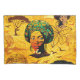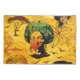 Minha Design apresenta um retrato estilizado de uma linda mulher africana vestindo um manto colorido. A capa é enfeitada com padrões de folhas verdes e amarelas. Seu rosto está cheio de uma silhueta por sol, cheia de pássaros voando pelo céu e uma paisagem com árvores. Ela veste brincos grandes e ornamentados e um colar com a bainha. Estilo de Arte Pop original Ilustração vetorial Copyright BluedarkArt The ChameleonArt.