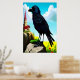 Um corvo preto sentado sobre uma pedra com um castelo ao fundo. Esta é uma arte gerada por IA.