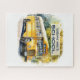 Um quebra-cabeça de quebra-cabeça com a imagem de um ônibus escolar retrô e texto: Bem-vindo de volta à escola.
