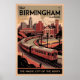 Uma ilustração de poster de viagens inspirada em vintage mostrando Birmingham, Alabama, renderizada em um estilo que lembra os posters de Deco de 1920. A cena apresenta uma representação estilizada da linha do horizonte Birmingham, incluindo edifícios icônicos como o Red Mountain Inn, com uma rodovia enrolante em direção ao centro da cidade. Um trem de passageiros vintage, colorido em vermelho profundo e bege, se curva graciosamente ao longo dos trilhos em primeiro plano, criando um senso de movimento e aventura. A poster apresenta as palavras "VISIT BIRMINGHAM" em uma fonte serif clássica no topo, enquanto uma legenda menor no final lê "A Cidade Mágica do Sul" em um estilo semelhante, todas colocadas sobre um fundo de tons de sépia silenciados e padrões sutis de nuvem.