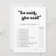Ele Disse Que Ela Disse, Adivinha Quem Disse!: Um jogo engraçado para o seu Chá de panela. Um tema trágico retrô: adote este design tipográfico ligeiramente vintage e na moda para sua papelaria de Chá de panela, com um tema clássico preto e branco. Texto personalizável, cores e fundo.