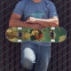 Retro-futurist wall art skateboard, poster style. A girl with roses and birds on her head is surrounded by various small animals and mushrooms, surrealistic style, dark yellow hair, blue eyes, light green background, vector illustration, full body portrait, front view, happy face, cute, detailed features, high definition resolution, solid color background, dynamic lines, beautiful colors, in the style of a detailed facial features