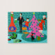 Esta família retrô, a trimagem do Quebra-cabeça de árvore de Natal contém todas as tradições de Natal, mas o bolo de frutas. A família de desenhos animados de 1960 está em casa na sala de meio século moderna. Há uma parede de tijolos turquesa e trevo e uma lareira de cone vermelha com um fogo rugoso. Pai está vestindo um terno preto e gravata vermelha. Ele está pendurando meias de Natal verde na mod chaminé com cuidado. Ao lado do pai, Júnior está preso precariamente numa cadeira laranja. Uau! Calma aí, Junior! Ele está se aproximando para colocar um ornamento em uma árvore de Natal gatinha, rosa, que já está decolada com ornamentos de pétalas e uma estrela amarela. No lado oposto da árvore, a mãe está segurando um presente festivamente envolvido. Não é permitido trepar! Mamãe está vestindo um vestido vermelho brilhante com um molde branco. Ela também está vestindo um chapéu de Papai Noel. Abaixo da árvore, há um gato preto vestindo um arco vermelho. No chão, há um gravador verde e preto cercado por álbuns coloridos de vinil. Você só sabe que a família está cantando junto com suas canções favoritas de Natal enquanto eles estão descendo os corredores.