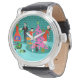 Este Retro Family Trimming the Christmas Tree Watch contém todas as tradições de Natal, mas o fruitcake. A família de desenhos animados de 1960 está em casa em sua sala de estar moderna de meio século. Há uma parede de tijolos turquesa e lacrimejante e uma lareira de cone vermelha, com um fogo rasteiro. Pai está vestindo um terno preto e gravata vermelha. Ele está pendurando meias verdes de Natal na chaminé mod com cuidado. Ao lado do pai, Júnior é pregado precariamente numa cadeira laranja. Uau! Calma, Junior! Ele está se aproximando para colocar um ornamento em uma árvore de Natal, rosa e gatinha, que já está escondido com ornamentos de coleira e uma estrela amarela. No lado oposto da árvore, a mãe está segurando um presente festivamente envolto. Ei, não é permitido tremer! Mamãe está vestindo um vestido vermelho brilhante com uma roupa branca. Ela também está vestindo um chapéu de Papai Noel. Sob a árvore, há um gato preto elegante vestindo um arco vermelho. No chão, há um gravador verde e preto cercado por álbuns coloridos de vinil. Você só sabe que a família está cantando junto com as suas canções de Natal favoritas enquanto eles estão descendo os corredores.