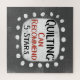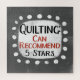 Um design tipográfico engraçado que diz "Quilting: Can Recommended, 5 Stars". É texto preto e vermelho em um retângulo branco com pontos brancos engraçados e brincalhões ao seu redor, tudo em um fundo de cinza.