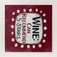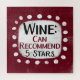 Um design tipográfico engraçado que diz "Vinho: Pode Recomendar, 5 Estrelas". É um texto preto e vermelho borrado em um retângulo branco com pontos brancos engraçados e brincalhões ao seu redor, todos em um fundo burgundy.