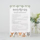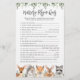 Os animais florestais têm o tema de cartão de teste de rhyme de berçário de chá de fraldas e apresentam uma ilustração de animais de madeira de cor d'água e verde eucalipto garland e uma elegante letra de estilo manuscrito.