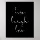 Rir ao vivo, palavras inspiradoras para este poster negro minimalista.