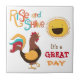 Aqui está um azulejo de cozinha alegre e colorido que apresenta um galo colorido e um sol brilhante e sorridente. O texto estilizado acima da escala diz "Rise and Shine", e abaixo do sol, "É um DIA EXCELENTE". As cores incluem vermelho-marrom, ouro e azul-lacrimogêneo. Bonita! *O Clip art usado neste design é protegido por direitos autorais pela Encore Software, Inc., que permite o uso a seus licenciadores. Todos os direitos reservados.