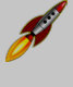 Um foguete retrô estilo 1940/50 explora em órbita, ou talvez na Lua ou Marte.