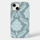 A vintage style decorative damask off-set surface pattern influenced by rococo classical design in duck egg blue color detail on a teal background.