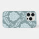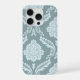A vintage style decorative damask off-set surface pattern influenced by rococo classical design in duck egg blue color detail on a teal background.