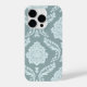 A vintage style decorative damask off-set surface pattern influenced by rococo classical design in duck egg blue color detail on a teal background.
