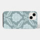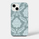 A vintage style decorative damask off-set surface pattern influenced by rococo classical design in duck egg blue color detail on a teal background.