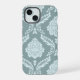A vintage style decorative damask off-set surface pattern influenced by rococo classical design in duck egg blue color detail on a teal background.