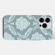 A vintage style decorative damask off-set surface pattern influenced by rococo classical design in duck egg blue color detail on a teal background.