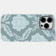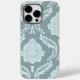 A vintage style decorative damask off-set surface pattern influenced by rococo classical design in duck egg blue color detail on a teal background.
