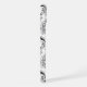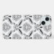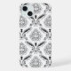 A vintage style decorative damask surface pattern influenced by rococo classical design in black line and leaf fill details on a white background.