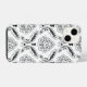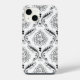 A vintage style decorative damask surface pattern influenced by rococo classical design in black line and leaf fill details on a white background.