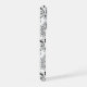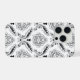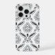 A vintage style decorative damask surface pattern influenced by rococo classical design in black line and leaf fill details on a white background.