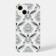 A vintage style decorative damask surface pattern influenced by rococo classical design in black line and leaf fill details on a white background.