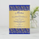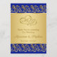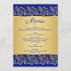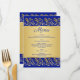 Ouro de folhas e corações unidos em um Cartão de Menu Real Azul de Casamento.