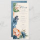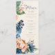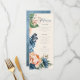 Um floral brilhante e ousado de rosas em tons de azul empoeirado e pêssego é o ponto focal de muitas das peças desse suite de casamento que também contém textos elegantes e layouts modernos de design. O cardápio de casamento mostrado aqui tem uma borda lateral de rosas e uma bela abstrato de aquarela no verso em azul empoeirado. Insira facilmente os detalhes pessoais do menu, a data do casamento, a noiva e as iniciais do noivo usando o modelo fornecido. Procure ID584 para ver todas as peças correspondentes neste belo conjunto de casamento.