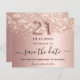 Uma moeda e uma tendência Salve a placa de Data para um aniversário de 21 anos. fundo rosa de gradiente dourado decorado com poeira brilhante rosa faux. Personalize e adicione uma data e um nome/texto. O texto: Salvar a Data é gravado com um script de estilo com letra de tendência grande com alternâncias. Número 21 com uma fonte no estilo do balão.