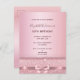 Um convite moderno, na moda e glamouroso para o aniversário de 30 anos de uma mulher. Um fundo metálico rosa dourado falso com um arco de ouro rosa elegante, fita e brilho. O nome é escrito com um moderno e escuro, rosa dourado, escrito com letra de estilo manuscrito. Modelos para os detalhes da sua festa. Dica: Se você não quiser que pareça um cartão postal, clique em personalizar, vá para o verso e remova o divisor e o carimbo de posto.