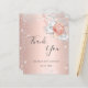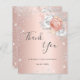 Um cartões de agradecimentos para um aniversário de 50 anos (ou qualquer idade). Uma cor metálica de fundo rosa dourada falsa. Decorados com florais de ouro branco e rosa e poeira fina. À frente, um grande texto escrito à mão e o texto: Obrigado, seu texto, título e uma data. Voltar: personalize e adicione seu nome e nota de agradecimento.