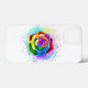 Rosa grande e florescente com pétalas arco-íris sobre fundo branco, pintadas com pedaços de tinta colorida e brilhante. 3d
