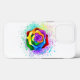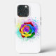 Rosa grande e florescente com pétalas arco-íris sobre fundo branco, pintadas com pedaços de tinta colorida e brilhante. 3d