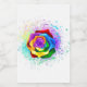 Rosa grande e florescente com pétalas arco-íris sobre fundo branco, pintadas com pedaços de tinta colorida e brilhante. 3d