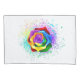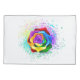 Rosa grande e florescente com pétalas arco-íris sobre fundo branco, pintadas com pedaços de tinta colorida e brilhante. 3d
