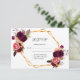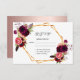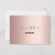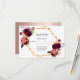 Um cartão RSVP elegante para um casamento com modelos para resposta por data, nomes etc. Penas e rosas de cor aquosa, flores em burgundy. Um falso quadro de ouro e branco. Um fundo branco na frente, texto preto. Nomes da noiva e do noivo, e a data do casamento. Um fundo de aparência metálica falsa rosa dourado. Texto preto.