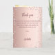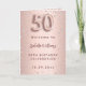 Um fundo gradiente em rosa dourado falso com diamantes rosa. O nome é escrito com um estilo de letra à mão moderna em cor rosa dourado escuro. O número 50 é escrito com uma fonte estilo balão, cursiva. Texto de boas-vindas, foto, cardápio e um agradecimento no verso.