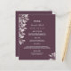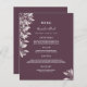 Um cartão de casamento elegante e moderno. Flores botânicas de cor rosa poeirenta, folhas. Modelos para seus nomes, data e menu de casamento. Um chic cassis, fundo cor roxa. Letras brancas coloridas. Traseira: fundo colorido do gabinete.