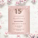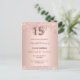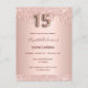 Um convite moderno, na moda e glamouroso para a Quinceañera, festa de aniversário 15. Um fundo rosa dourado com pingos, pintura pingada. O nome é escrito com um moderno e escuro, rosa dourado, escrito com letra de estilo manuscrito. Personalize e adicione os detalhes da sua festa. O número 15 é escrito com uma fonte de estilo balão, script.