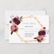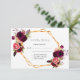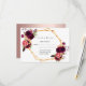 Um cartão RSVP elegante para um casamento com modelos para resposta por data, nomes etc. Penas e rosas de cor aquosa, flores em burgundy. Um falso quadro de ouro e branco. Um fundo branco na frente, texto preto. Nomes da noiva e do noivo, e a data do casamento. Um fundo rosa dourado. Texto preto.