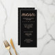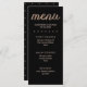Estes cartões de cardápio de na moda têm um fundo preto escuro e um texto de cor rosa dourado da moda. A tipografia elegante acrescenta um toque extra de rico. A parte traseira do menu apresenta um padrão pontilhado rosa a dourado igual.