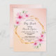Um elegante convite para chá de fraldas de verão tropical. Com uma falsa estrutura geométrica de ouro decorada com hibisco de rosas claro, flores tropicais com um pouco de verde. Um fundo rosa dourado e cinza rosa-claro. O nome da mãe a ser está escrito com um moderno roteiro de estilo. Texto preto. Fundo: rosa dourado e plano de fundo rosa-claro. Sexo neutro ou celebração de uma menina. Dica: Se você não quiser que pareça um cartão postal, clique em personalizar, vá para o verso e remova o divisor e o carimbo de posto.
