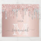 Um rosa dourado de moenda esmaecida metálico, com aspecto de folha de fundo decorado com pingos de brilho sujo, pintura gota a rosa, ouro rosa e prata. Personalize e adicione um ano, seu nome e sua letra monográfica. Texto em cinza escura e branco. O nome é escrito com um moderno estilo escrito à mão com traços. Para manter as hastes, exclua apenas o nome da amostra, deixe os espaços ou emoji na frente e depois do nome. Perfeito para uma festa de aniversário ou chá de panela marco.