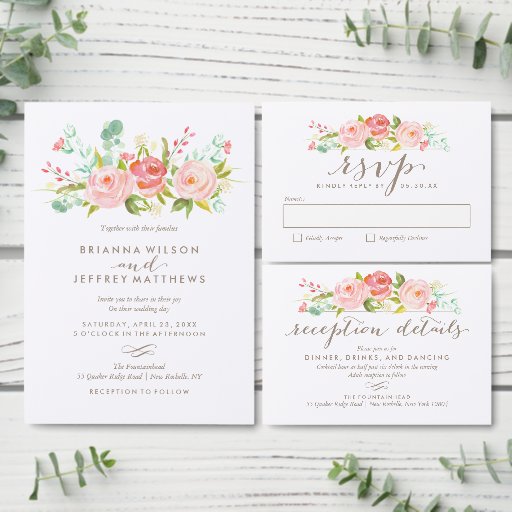 Este belo menu apresenta rosas de cor d'água e uma fonte de caligrafia de na moda.