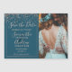 Rosa gold confetti salve a foto da data com tipografia de fontes elegante, faux rosa dourado foil confetti e quadro geométrico num fundo azul verde escuro editável.