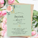 Um plano verde da moda. Decorados com ouro-rosa e folhas de eucalipto cor-de-rosa-esbranquiçada, flores de rosa e cor-de-rosa-esbranquiçada, galhos, verde-verde e um cinzeiro de ouro falso. Personalize e adicione o nome da noiva a ser e os detalhes da festa. 1 folha = 1 convite impresso de borda a borda.