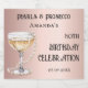 Uma cor de fundo rosa dourada. Decorado com um copo de espumante de ouro Prosecco e pérolas. Adicionar um nome e uma data.